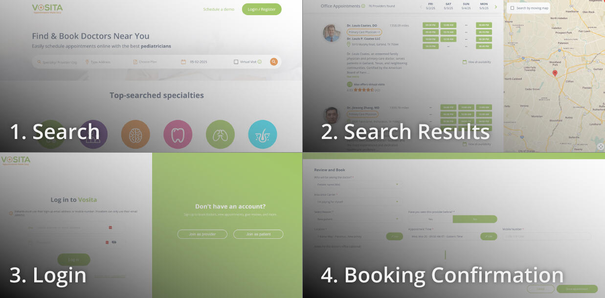 The guest user journey on Vosita began on the homepage, where users would input details like their desired specialty or provider name, location, insurance, preferred date, and appointment type (in-office or virtual). Once they hit search, they’d land on the results page, which displayed a list of available doctors matching their criteria along with open timeslots.However, if a guest user selected a timeslot without being signed in, they’d be redirected to the login page (which, by the way, was in need of a redesign—I’ve detailed that in a separate case study here). New users without an account would then need to locate the sign-up button to create one. After signing up, they’d have to manually log in, which would finally take them to the booking confirmation page.But here’s where things got tricky. To prevent fake bookings, users were required to verify their email address and provide a mobile number (which wasn’t collected during sign-up). Most users, unaware they could simply check their inbox in a new tab, would navigate away from the booking page to their profile settings to confirm their email. This action reset their progress, forcing them to start over: re-entering their search criteria, selecting a doctor, choosing a timeslot, and confirming their mobile number through a modal wizard. Only then could they finally book their appointment.This back-and-forth created unnecessary friction and frustration, often leading users to abandon the process altogether. It became clear that simplifying and streamlining this journey was critical to improving the overall user experience.