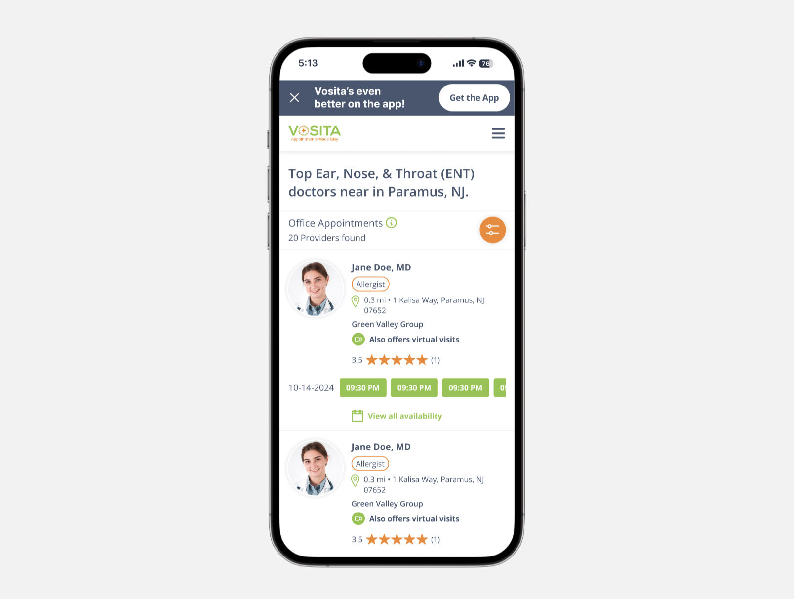 This sticky bar displays the appointment type and the number of doctors found, along with a “Filters” button that opens an overlay for adjusting search criteria. This change completely eliminated the confusion users experienced when they didn’t realize they’d been navigated to a new page after hitting “Search” on the homepage.The new sticky bar takes up minimal vertical space, allowing the list of providers to be displayed front and center. This aligns better with user expectations and creates a more seamless experience.These updates to the search bar were designed to reduce friction, minimize cognitive load, and get users to their desired results as quickly as possible. By simplifying the interface and streamlining the flow, I aimed to create a more intuitive and efficient booking experience. Stay tuned for the next section, where I’ll dive into the changes I made to the search results page and beyond!