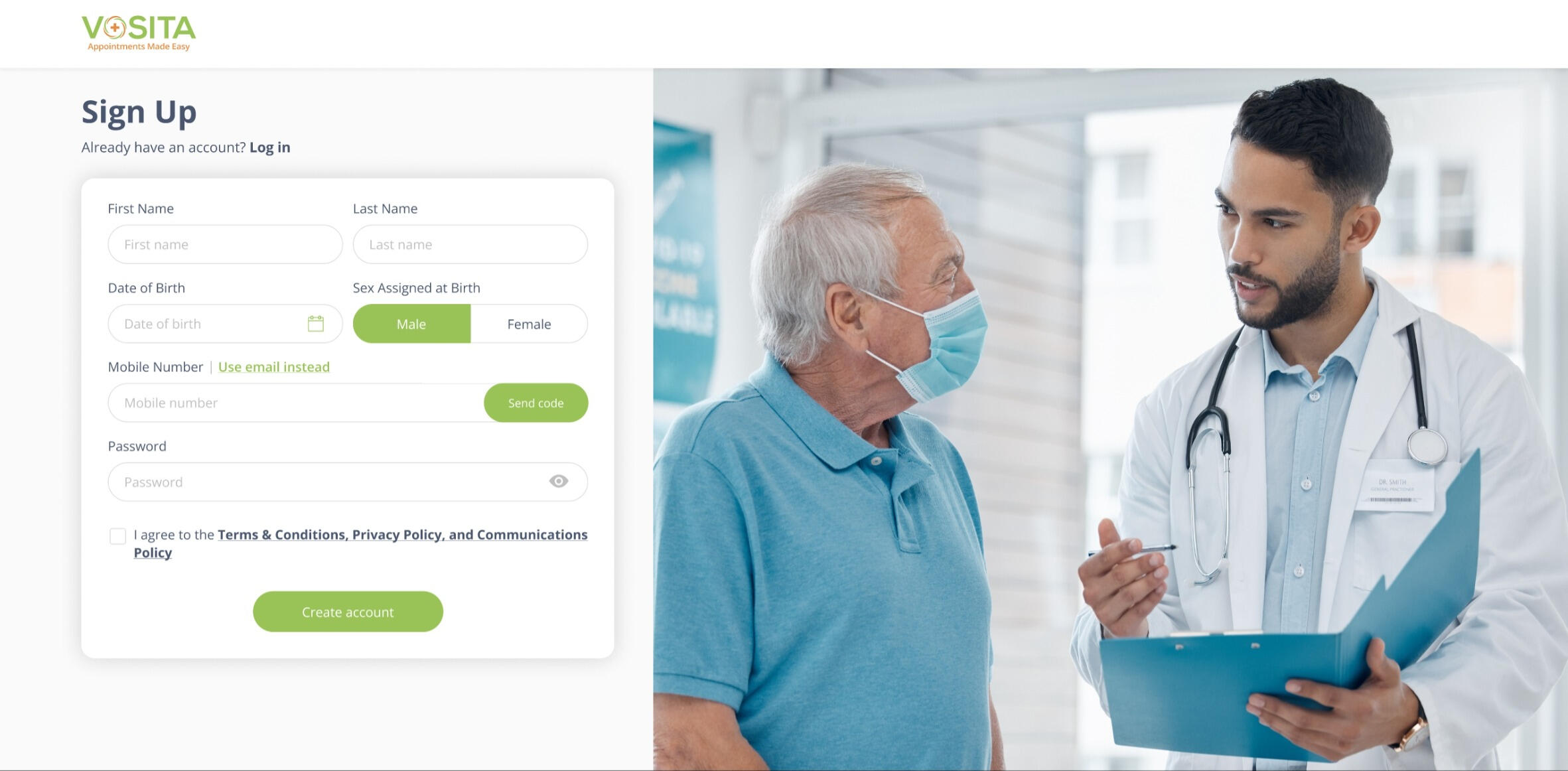 Vosita’s signup and login experience was fragmented, confusing users with a cluttered split-screen layout, unclear messaging, and unnecessary friction—especially on mobile. My goal was to streamline the flow, reduce cognitive load, and ensure a seamless transition from account creation to booking appointments.